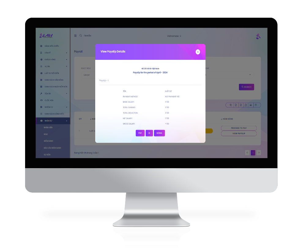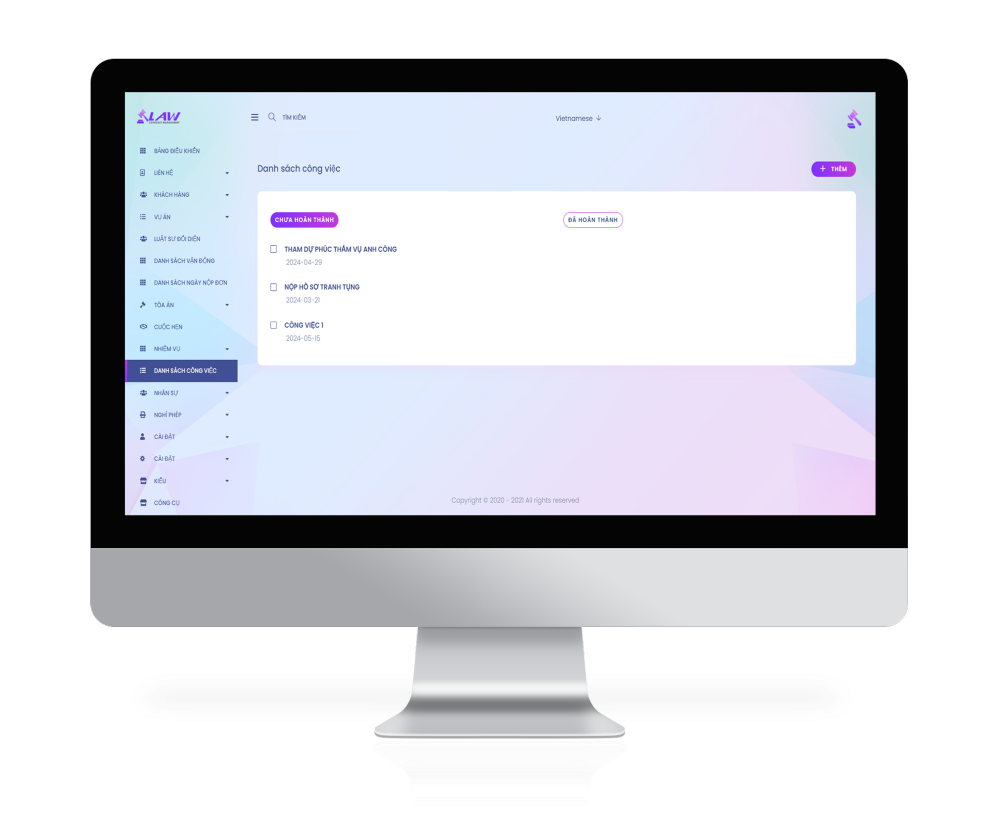 - Tổng hợp báo cáo về khách hàng, vụ việc, tài chính và nhân sự.