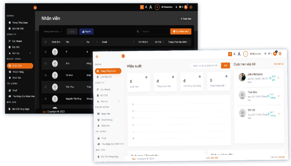 - Quản lý lịch hẹn cho khách hàng và nhân viên, bao gồm cả việc đặt lịch, thay đổi, hoặc hủy lịch.